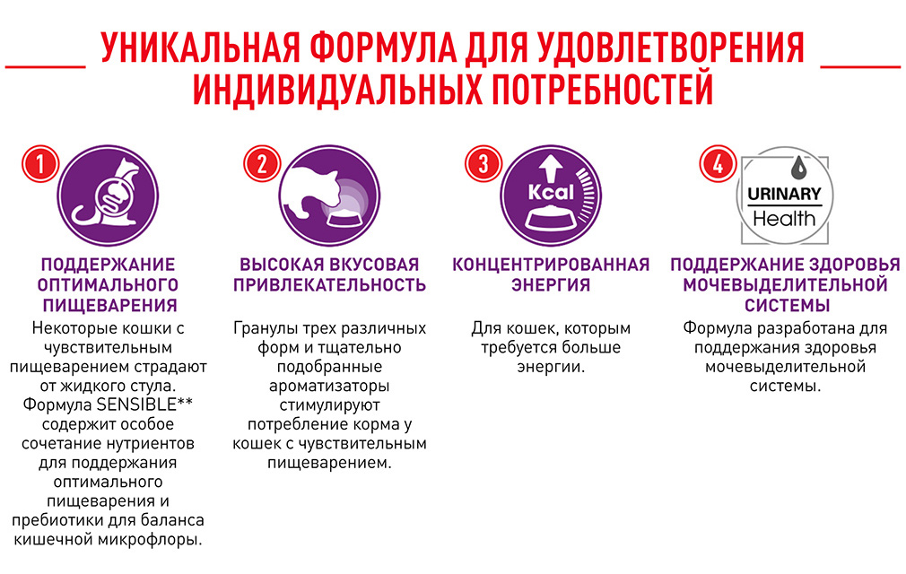 Корм Роял Канин для чувствительного пищеварения для кошек содержит легкоусвояемые белки L.I.P., которые снижают количество непереваренной пищи в кишечнике. Данная функция осуществляется за счет содержания в продукте свекольного жома и фруктоолигосахаридов.